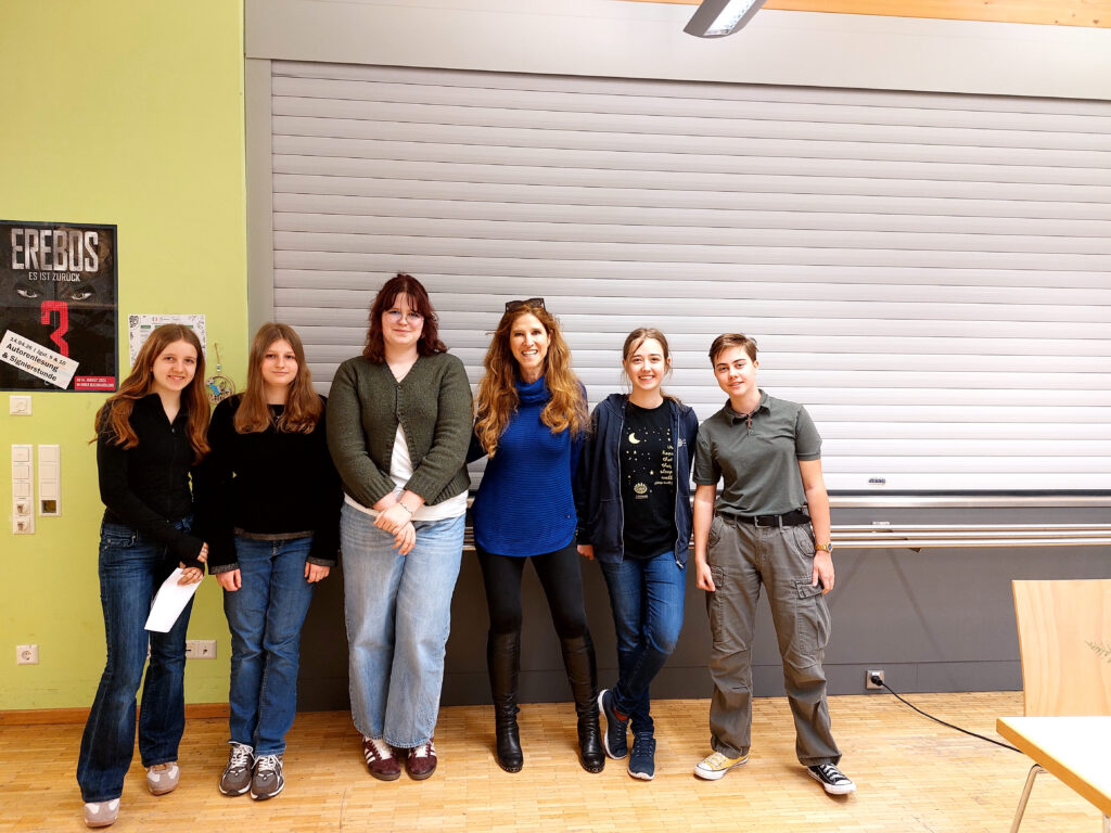 Nach einer schmissigen Begrüßung durch den Schulleiter und die Mitglieder des Bibliotheksteams begann Frau Poznanski in ihrem leichten Wiener Dialekt und mit viel Charme, das Handlungsgeschehen zu skizzieren. Sie las den Anfang des dritten Bandes der preisgekrönten Erebos-Serie über ein bösartiges, KI gesteuertes Computerspiel, das die Grenzen zwischen virtueller Welt und Realität verwischt. Wie in den Bänden zuvor, werden die jungen Protagonisten vom Spiel manipuliert, durch Eingriffe in ihr echtes Leben gezwungen, mitzuspielen, und dabei Grenzen zu überschreiten. Eine Schülerin aus dem Bib-Team beschrieb die Spannung beim Lesen, die dadurch entsteht, wie das Spiel und die Handlung in die Realität übergehen – letztendlich das große Thema der Trilogie.