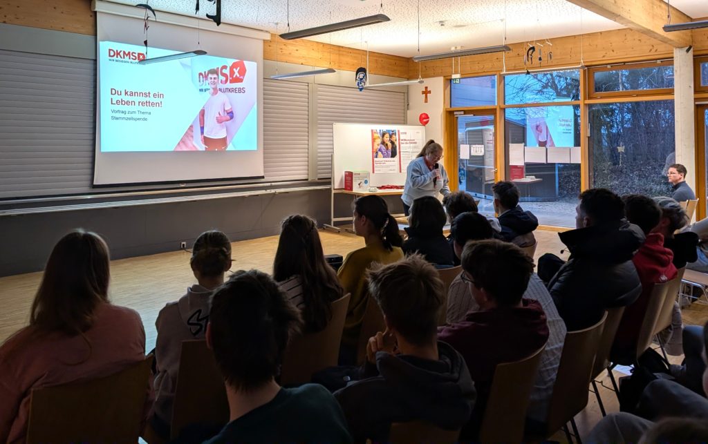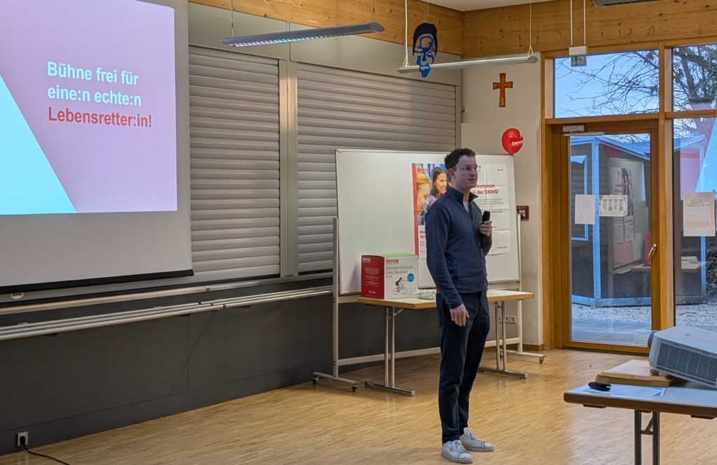 Kurz vor den Weihnachtsferien erhielten alle unsere 11.-13. Klassler einen Vortrag mit wesentlichen Informationen darüber, wie man mit Hilfe einer Stammzellspende zum Lebensretter für eine an Leukämie erkrankte Person werden kann. Ein junger Mann aus Waging, der bereits Stammzellen gespendet hat, berichtete eindrucksvoll über seine Erfahrungen. Anschließend konnten sich alle, die wollten, registrieren lassen.