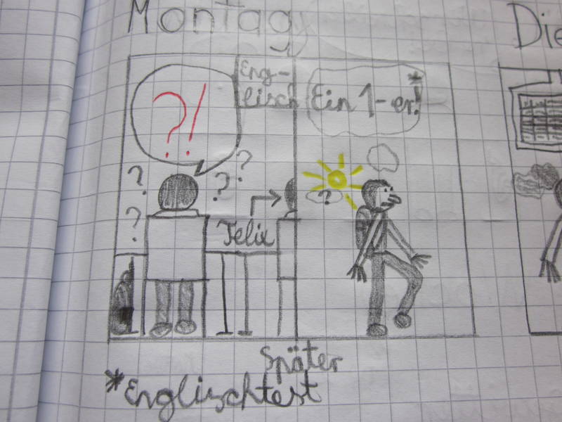 Außerdem haben die Schülerinnen und Schüler über die Anfangszeit an ihrer neuen Schule ein persönliches Comic-Tagebuch geführt, in dem sie Erlebnisse, Gefühle und Gedanken der ersten Schulwochen in Form von Comic-Zeichnungen, Sprechblasen und kleinen Texten dargestellt haben.