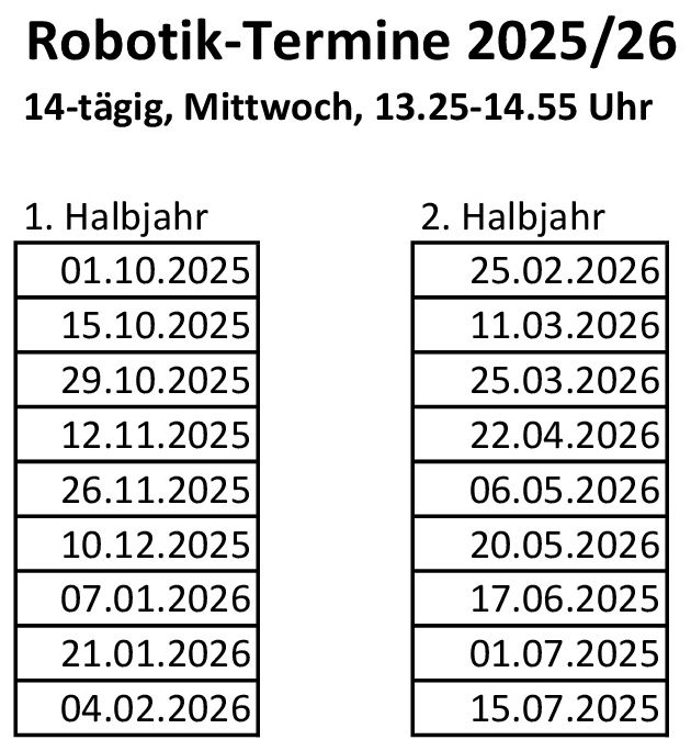 Im Schuljahr 2025/26 findet der Wahlunterricht Robotik für Schüler der 6.-10. Jahrgangsstufe statt, und zwar vierzehntägig am Mittwoch in der 8. und 9. Stunde in Lernlandschft 2. Im Mittelpunkt des Kurses steht das Programmieren einfacher EV3-Roboter mit der Programmiersprache Scratch.